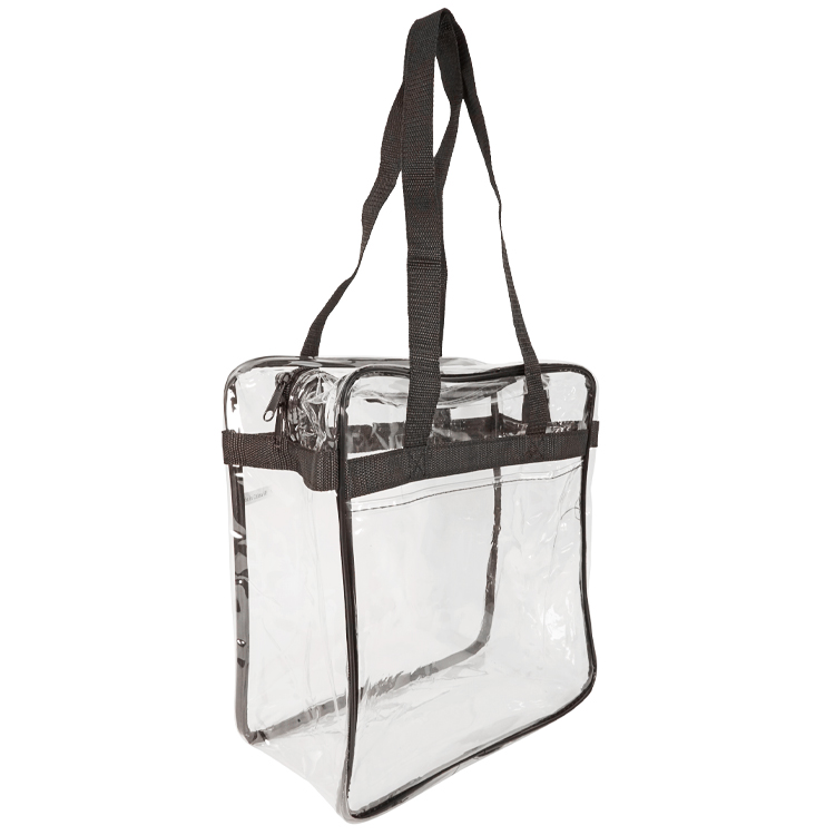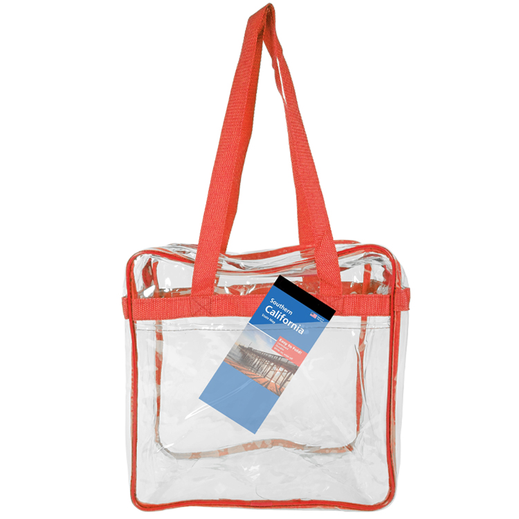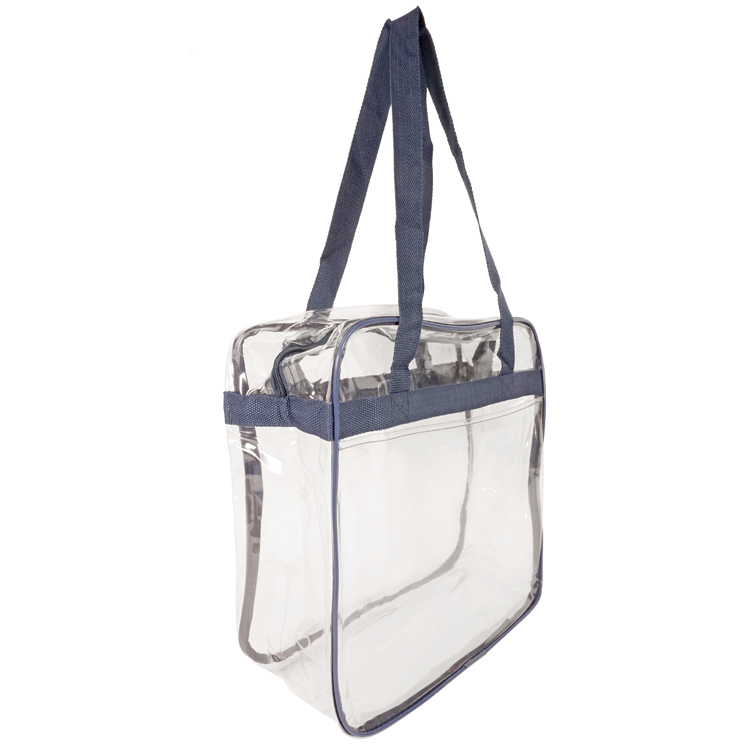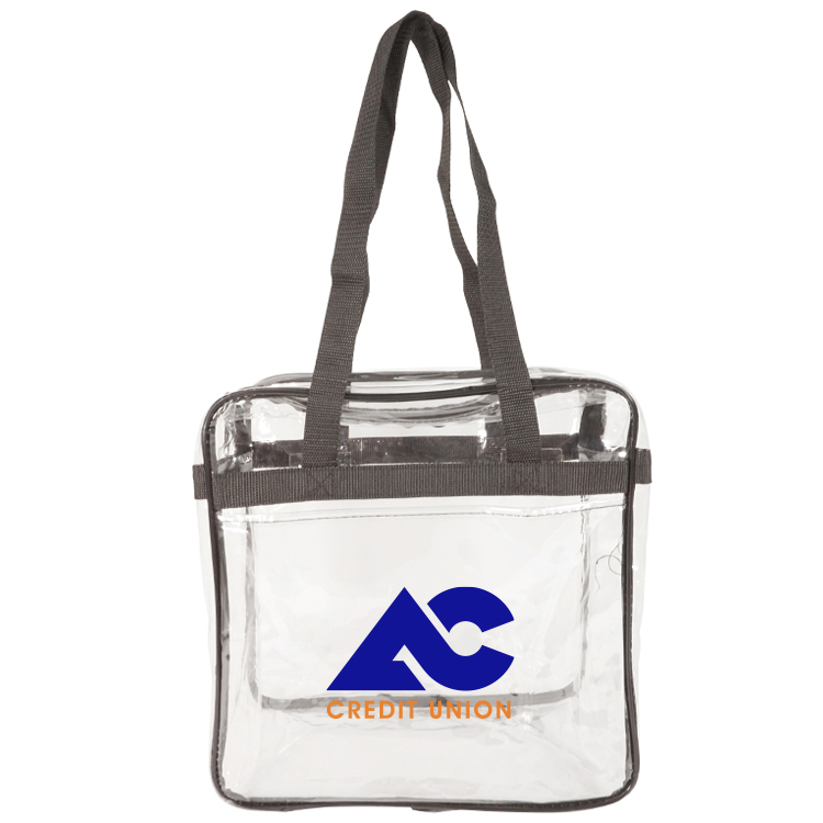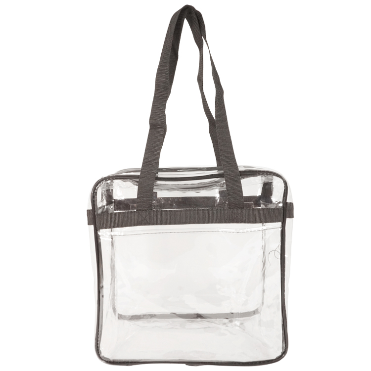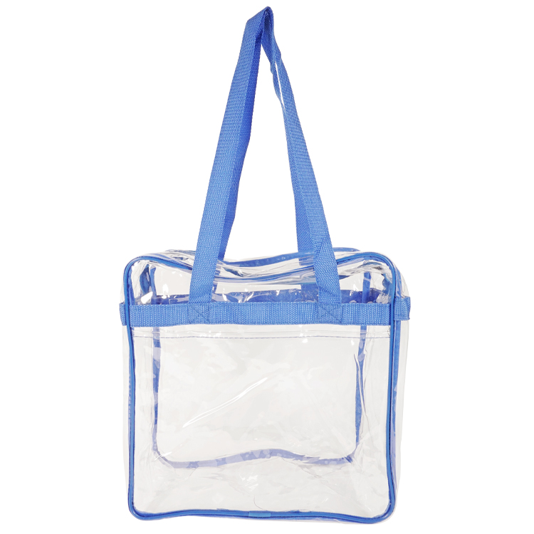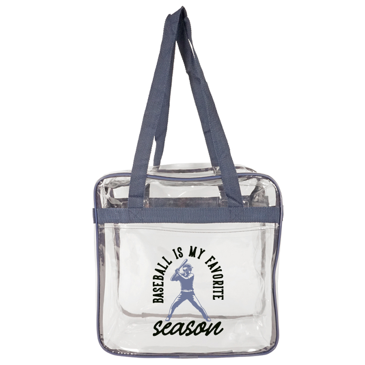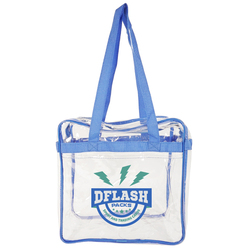 Introducing our Bondi Clear Front Pocket Tote, crafted from heavy clear PVC (0.3MM) to meet NFL stadium regulations. Measures 12"W x 12"H x 6"G with double zipper pulls, open front pocket, and long shoulder straps (29.5"). Stylish trim options like Clear/Black, Clear/Royal, Clear/Red, and Clear Navy. Personalize with logo on front pocket (7"W x 6"H) or back, or use NFL/PGA imprint area (3.4"W x 4.5"H) for compliance. The ultimate game day essential combining compliance, style, and practicality.